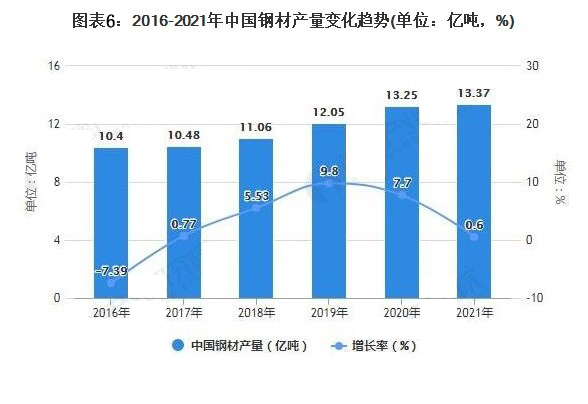 6、2016-2020年,我国钢材产量处于持续上升的趋势。2020年中国钢铁生产保持平稳增长。据国家统计局公布的数据,2020年,中国钢材产量13.25亿吨,同比增长7.7%。2021年1-12月,中国钢材产量为13.37亿吨,产量同比增长0.6%。
