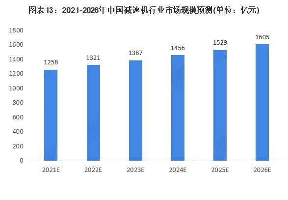 另一方面,在《中国制造2025》等相关政策文件的大力支持和宏观经济的稳步增长的背景下,工业自动化的趋势和环保、新能源发电等新兴行业的发展为减速机行业需求带来了新的增长点。前瞻预计2021-2026年中国减速机行业市场规模将会以5%的增长率增长,2026年市场规模将超过1600亿元。